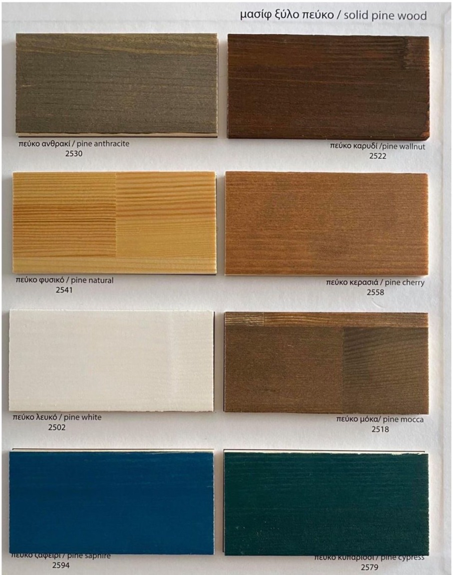 Κατασκευάζεται από μασίφ ξύλο πεύκου σε 8 διαφορετικές διαθέσιμες αποχρώσεις (πεύκο ανθρακί, πεύκο φυσικό, πεύκο λευκό, πεύκο καρυδί, πεύκο κερασιά, πεύκο μόκα, πεύκο ζαφείρι, πεύκο κυπαρισσί)