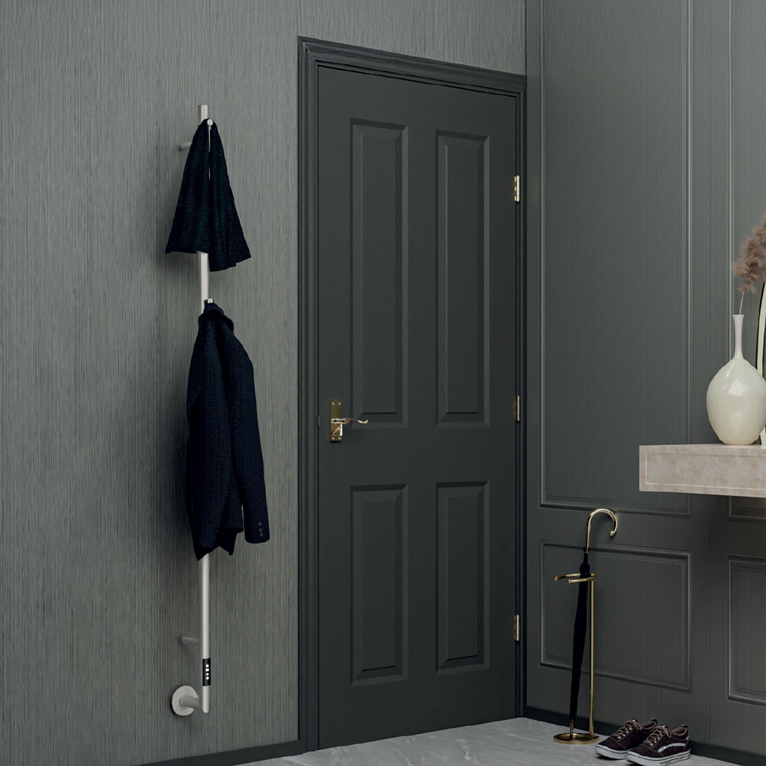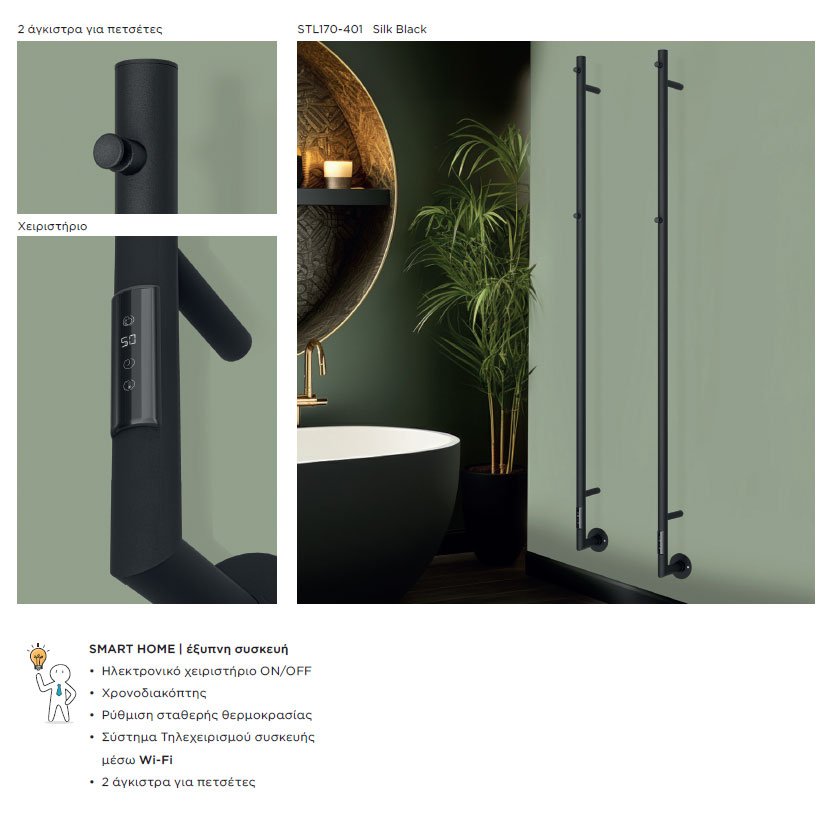 Διαθέτει ηλεκτρονικό χειριστήριο on/off, χρονοδιακόπτη και δυνατότητα ρύθμισης σταθερής θερμοκρασίας, ενώ χάρη στο ενσωματωμένο WiFi μπορείτε να το ελέγχετε εύκολα από το κινητό σας, εντάσσοντάς το πλήρως σε ένα smart σπίτι. Συμπληρώνεται με 2 πρακτικά άγκιστρα για πετσέτες, αποτελώντας μια ιδανική επιλογή για ένα μοντέρνο μπάνιο που συνδυάζει design, λειτουργικότητα και τεχνολογία.