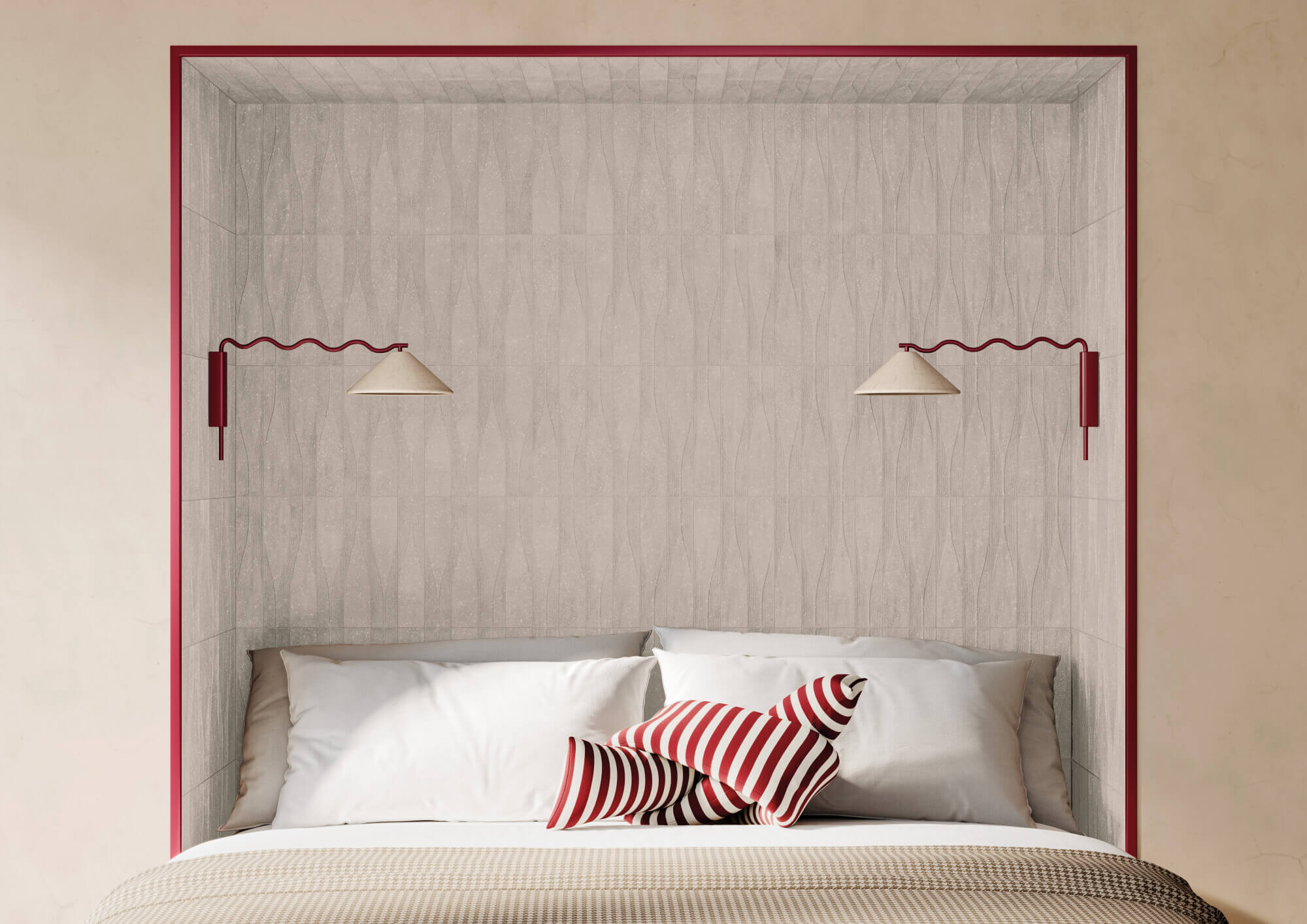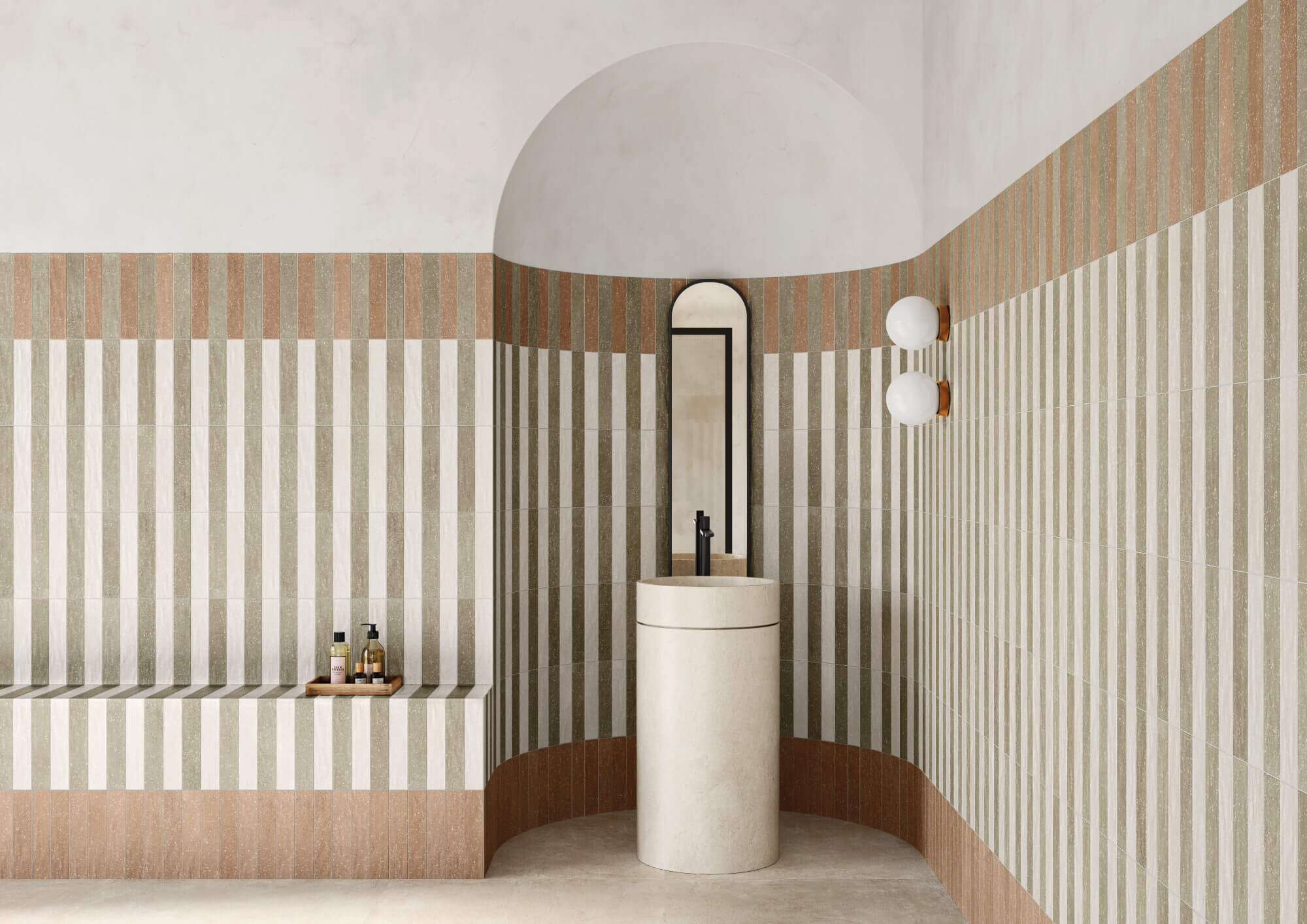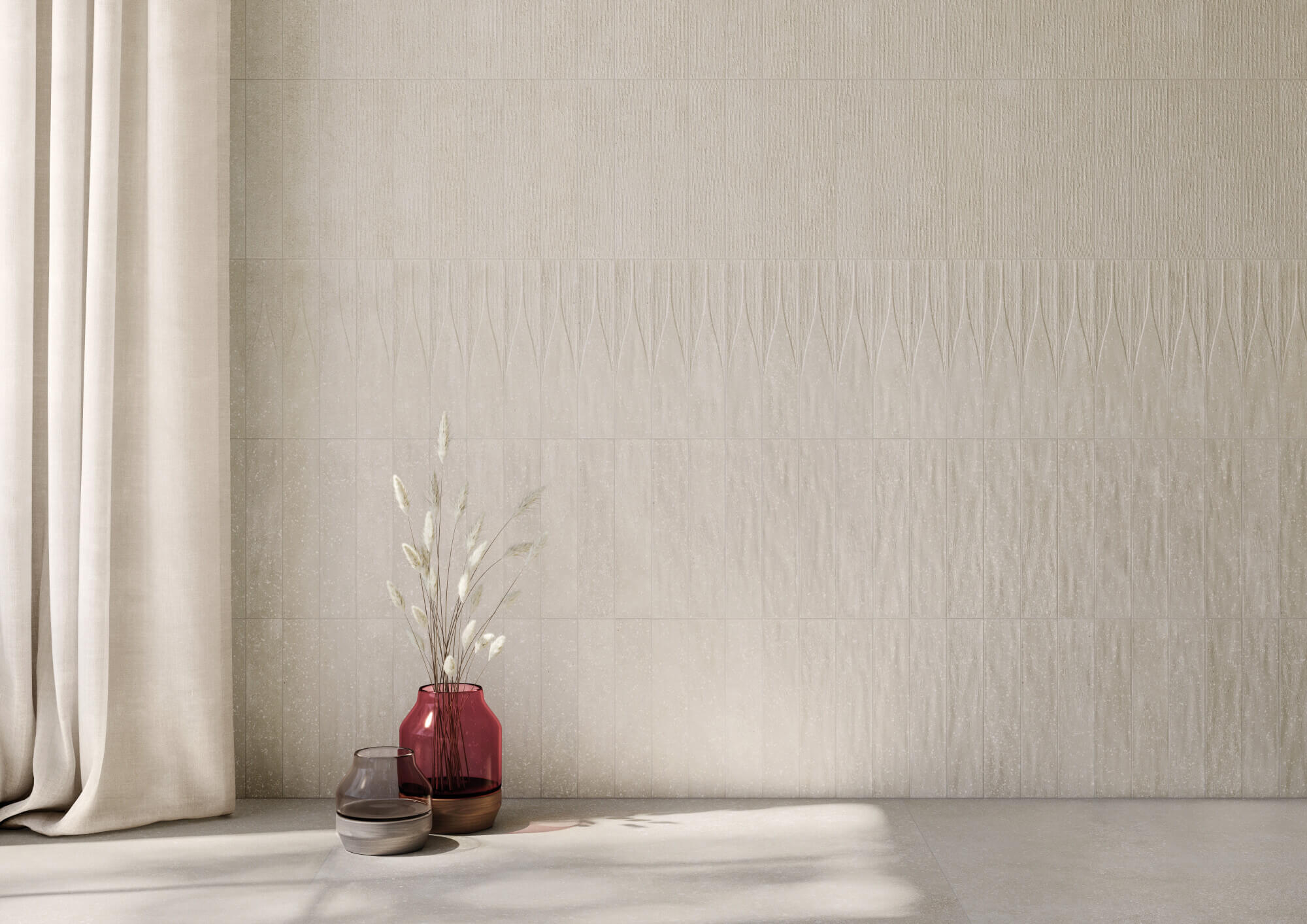 Με εκλεπτυσμένο μέγεθος τούβλου, η σειρά διατίθεται σε πέντε προσεκτικά επιλεγμένα χρώματα (White, Sand, Clay, Taupe και Green) και τρεις συμπληρωματικές υφές (Plain, Brushed, Waves). Το απλό (Plain), με λεία επιφάνεια, μεταφέρει γαλήνη και ισορροπία. Το βουρτσισμένο (Brushed), με έντονο ανάγλυφο, υποδηλώνει τη δύναμη ενός άμεσου, αυθόρμητου χτυπήματος. Τα κύματα (Waves), η μεταβατική υφή, ρέουν με απαλές καμπύλες που συνδέουν και τα δύο άκρα, δημιουργώντας έναν ρευστό και οργανικό οπτικό ρυθμό. Ο συνδυασμός αυτών των υφών εντός της ίδιας χρωματικής γκάμας επιτρέπει ευέλικτες και εκλεπτυσμένες συνθέσεις – ιδανικές για χώρους που στοχεύουν στην έκφραση της προσωπικότητας μέσα από τη λεπτομέρεια.